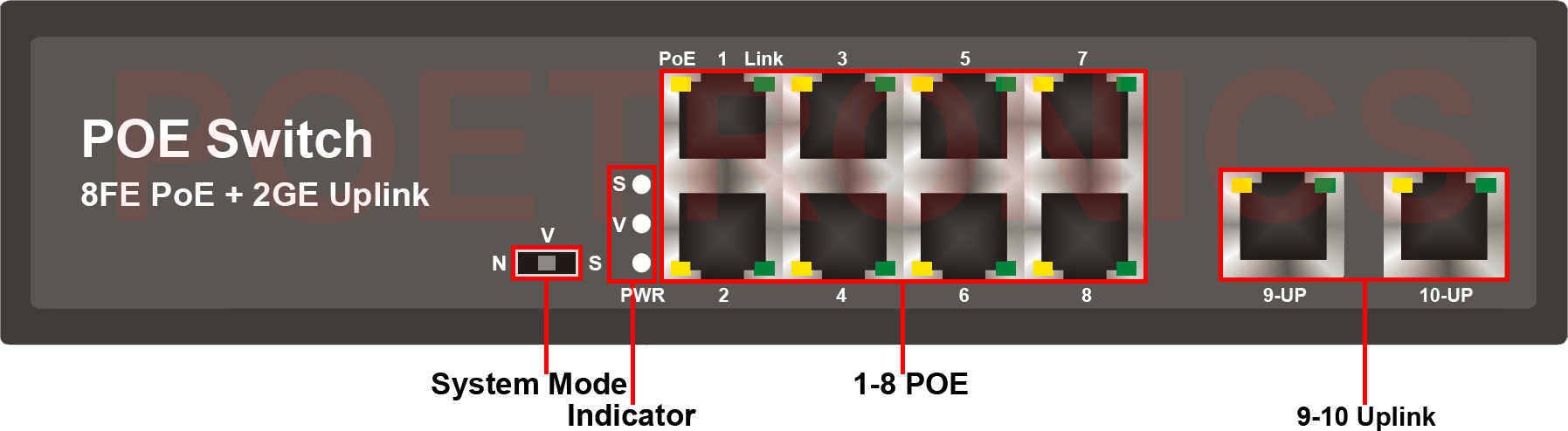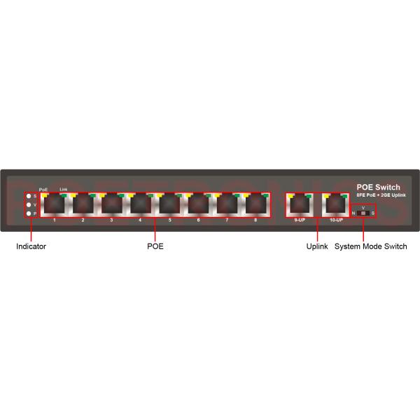 | Ports | 8 10/100Mbps POE + 2 10/100/1000Mbps Uplink |