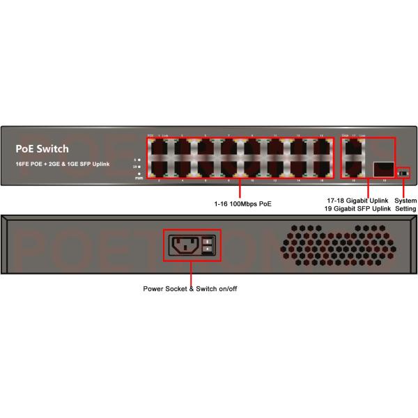 | Ports | 16 10/100Mbps POE + 2 10/100/1000Mbps Uplink |