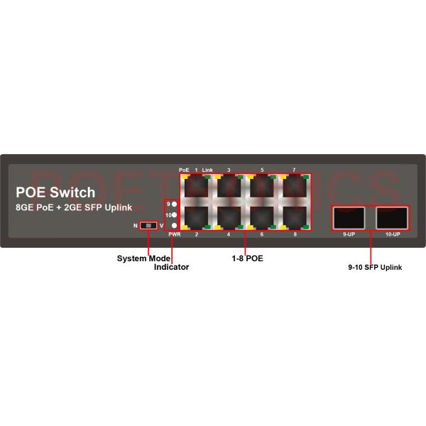 | Ports | 8 10/100/1000Mbps POE + 2 10/100/1000Mbps SFP Uplink |